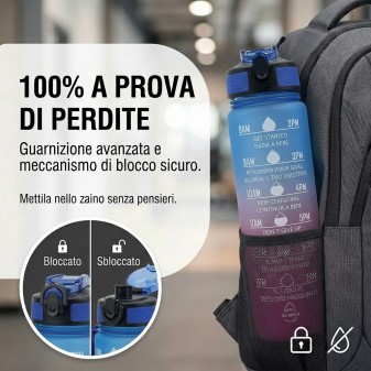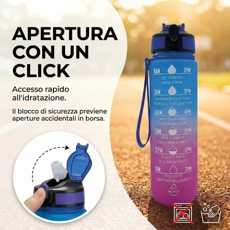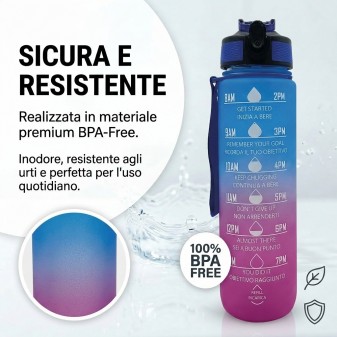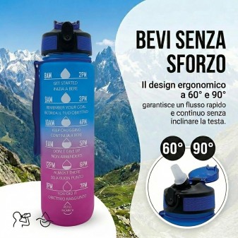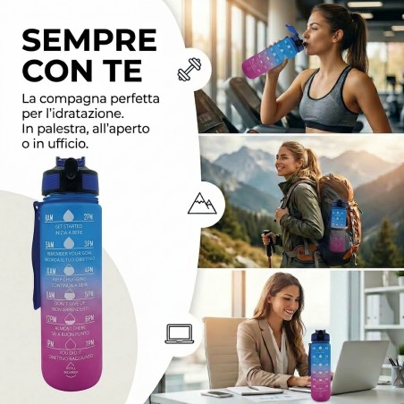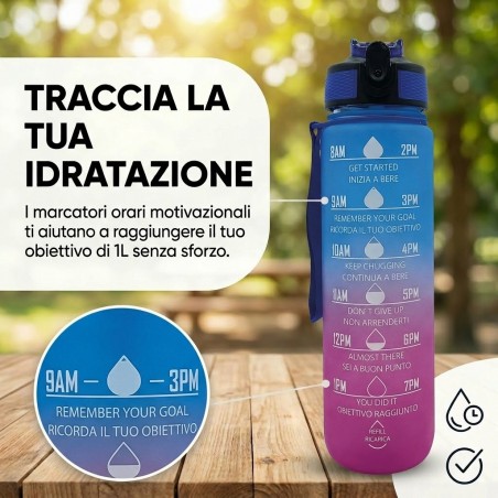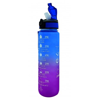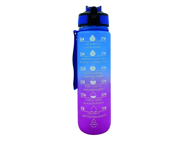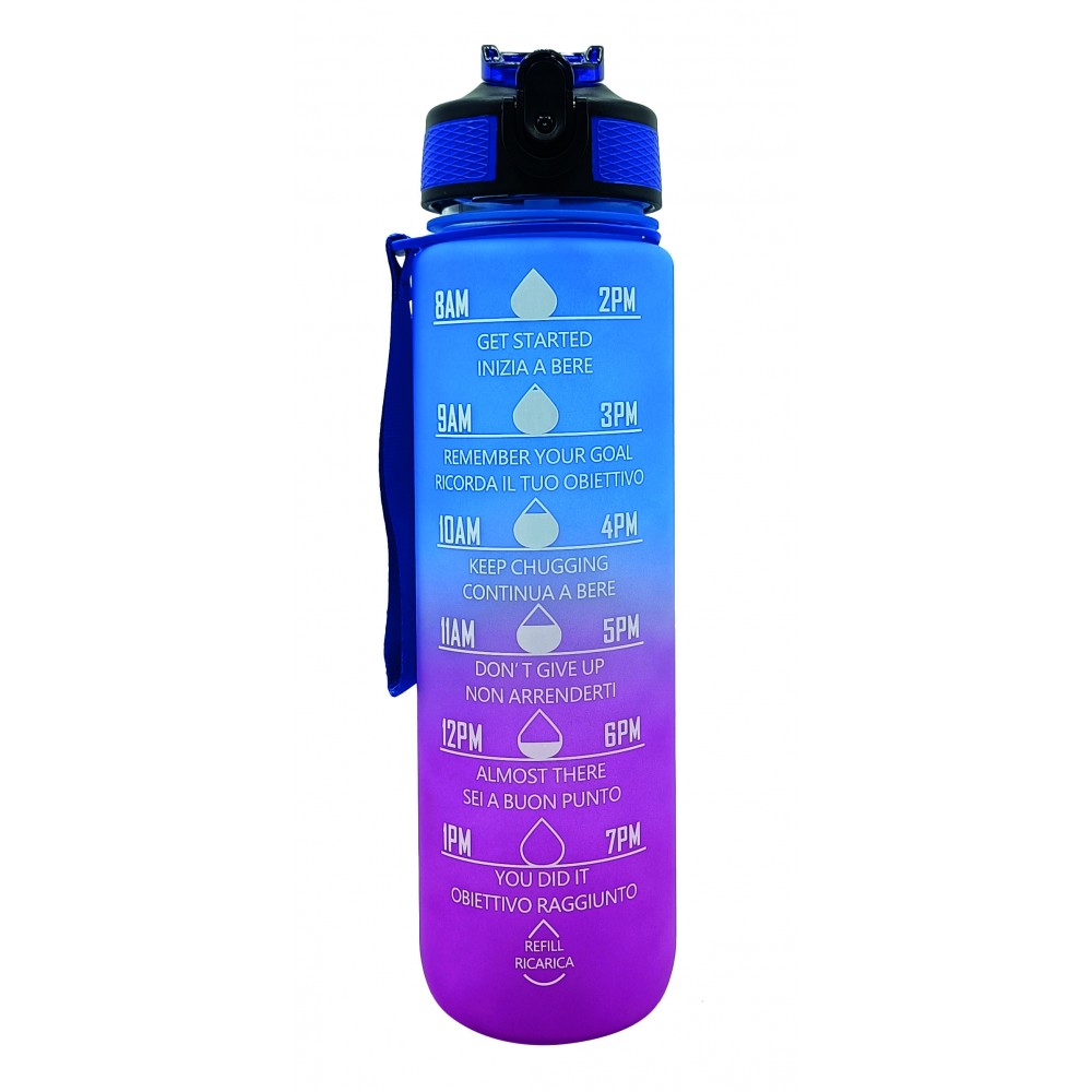 Borraccia Motivazionale 1L Blu e Viola: design sfumato con frasi motivazionali per monitorare l’idratazione quotidiana. Senza BPA e con tappo antigoccia.