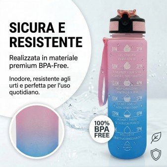 Le frasi motivazionali stampate sulla superficie aiutano a bere regolarmente e a raggiungere gli obiettivi di idratazione quotidiana. Realizzata in plastica resistente senza BPA, assicura un utilizzo sicuro e duraturo.