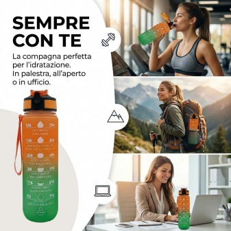 Borraccia Motivazionale 1L Arancio e Verde: design sfumato con frasi motivazionali per aiutarti a mantenere un’idratazione costante. Perfetta per ogni attività.