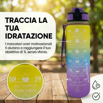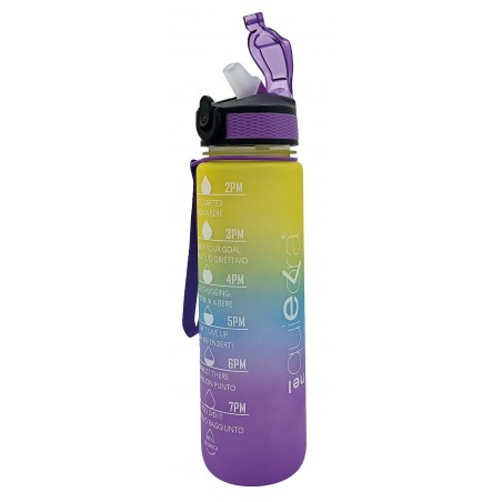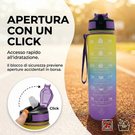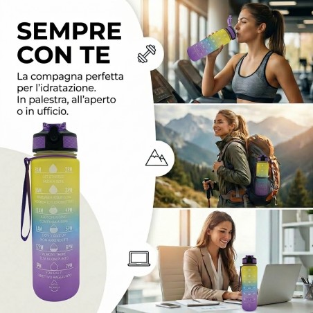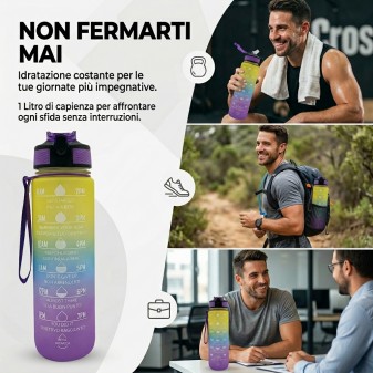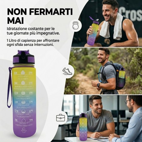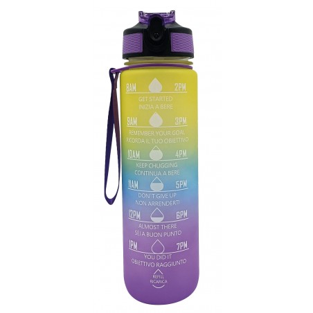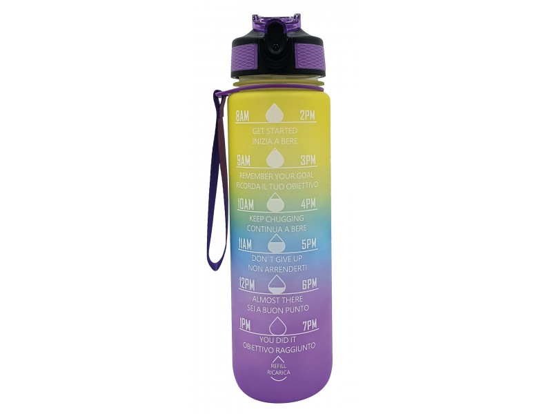 Borraccia Motivazionale 1L Multicolore: design sfumato e vivace con frasi motivazionali per incoraggiarti a bere di più ogni giorno. Perfetta per ogni attività.