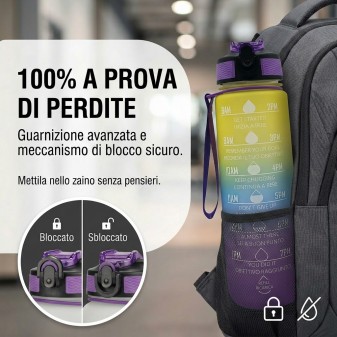 Dotata di frasi motivazionali stampate sulla superficie, ti aiuta a mantenere l’abitudine di bere acqua regolarmente. Il materiale senza BPA assicura un utilizzo sicuro e duraturo, mentre il tappo ermetico con guarnizione in silicone previene qualsiasi perdita.