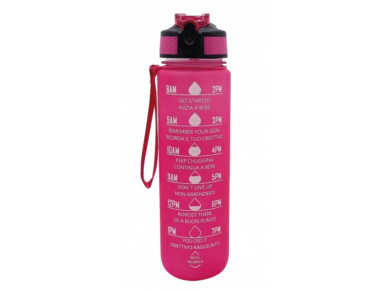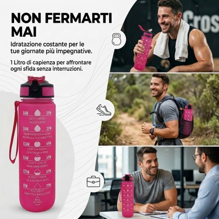 Borraccia Motivazionale 1L Rosa: design compatto e resistente con frasi motivazionali per mantenere l’idratazione sotto controllo. Perfetta per sport e lavoro.