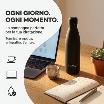 Chi cerca una soluzione pratica e duratura per ridurre il consumo di bottiglie monouso trova nella borraccia MATT in colorazione nera una risposta concreta: il design essenziale e il colore nero opaco si adattano a qualsiasi contesto d'uso, dall'ufficio alla palestra, senza rinunciare a un aspetto ordinato e personale.