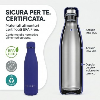 La struttura è composta da una parete interna in acciaio inossidabile 304 e una parete esterna in acciaio inossidabile 201, entrambi materiali certificati BPA Free e conformi alle normative alimentari europee. La finitura soft touch opaca e antigraffio protegge la superficie nel tempo e garantisce una presa stabile anche con le mani bagnate.