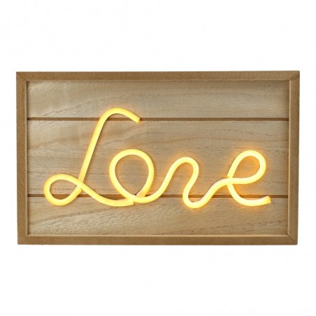 La parola “Love” è realizzata in stile calligrafico con un profilo LED caldo e avvolgente che risalta sul pannello in legno naturale.