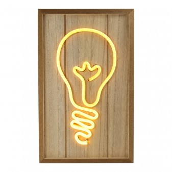 Il pannello in legno naturale esalta l’autenticità dei materiali, mentre il profilo luminoso a LED riproduce l’icona della classica lampadina con uno stile moderno e originale.