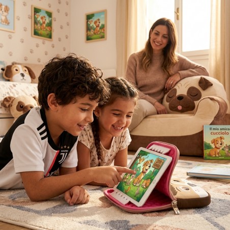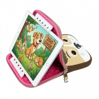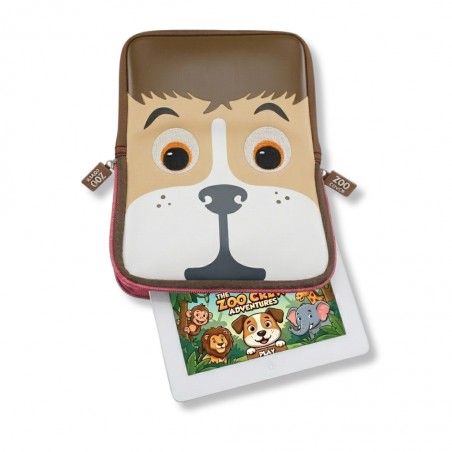 Una custodia imbottita a forma di cane, pensata per proteggere il tablet dei più piccoli in modo simpatico e sicuro.