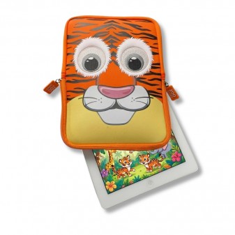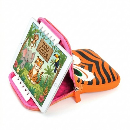 Il design con la faccia della tigre stimola la fantasia e rende l’utilizzo del tablet ancora più piacevole. I denti integrati nella zip aggiungono un tocco originale e aiutano a mantenere il tablet stabile quando la custodia è chiusa o utilizzata come supporto.